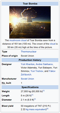 It becomes apparent that the Russian Tsar RDS-220 Hydrogen bomb is 3,000 times more powerful than the Hiroshima weapon; 99942 Apophis is 13 times more powerful than the Tsar.