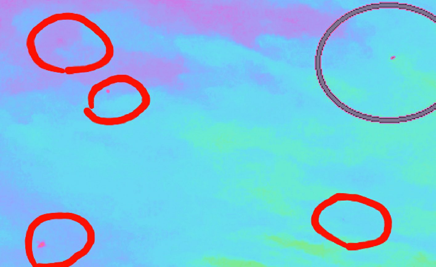 The top left corner UFO is clearly round ball shaped shifted outside of the visible spectrum.